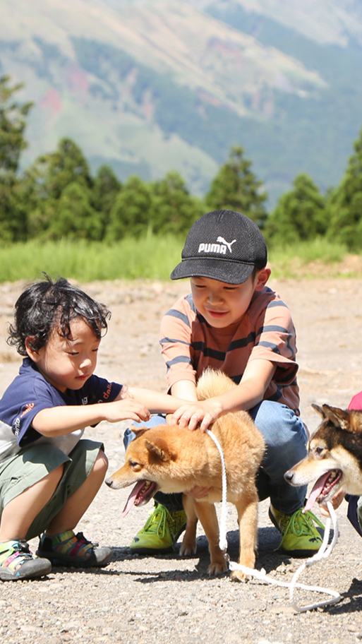 可愛い柴犬たちとふれあい、お散歩体験。子どもも一緒にお散歩できるので、家族連れに人気です。