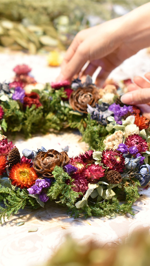 ドライフラワーを素材にオリジナルリースを作ります。庭園では季節の植物も楽しめます。