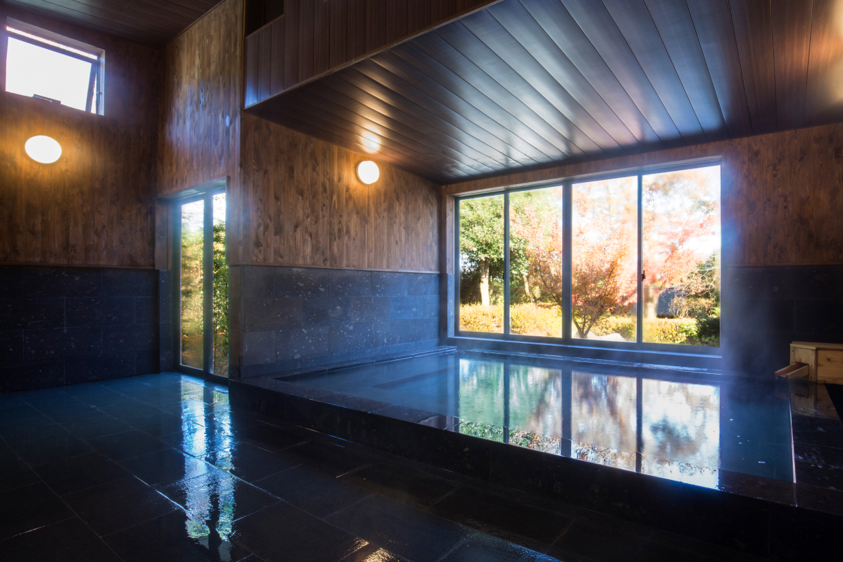 玄関は季節によって色づきが変わり、訪れる度に様々な表情でお客様をお出迎え。趣のある造りと竹あかりが優しく照らすロビーは、落ち着きのある雰囲気を演出。併設されたスーベニアスペースでは、地元南阿蘇のお菓子などのお土産をご購入いただけます。