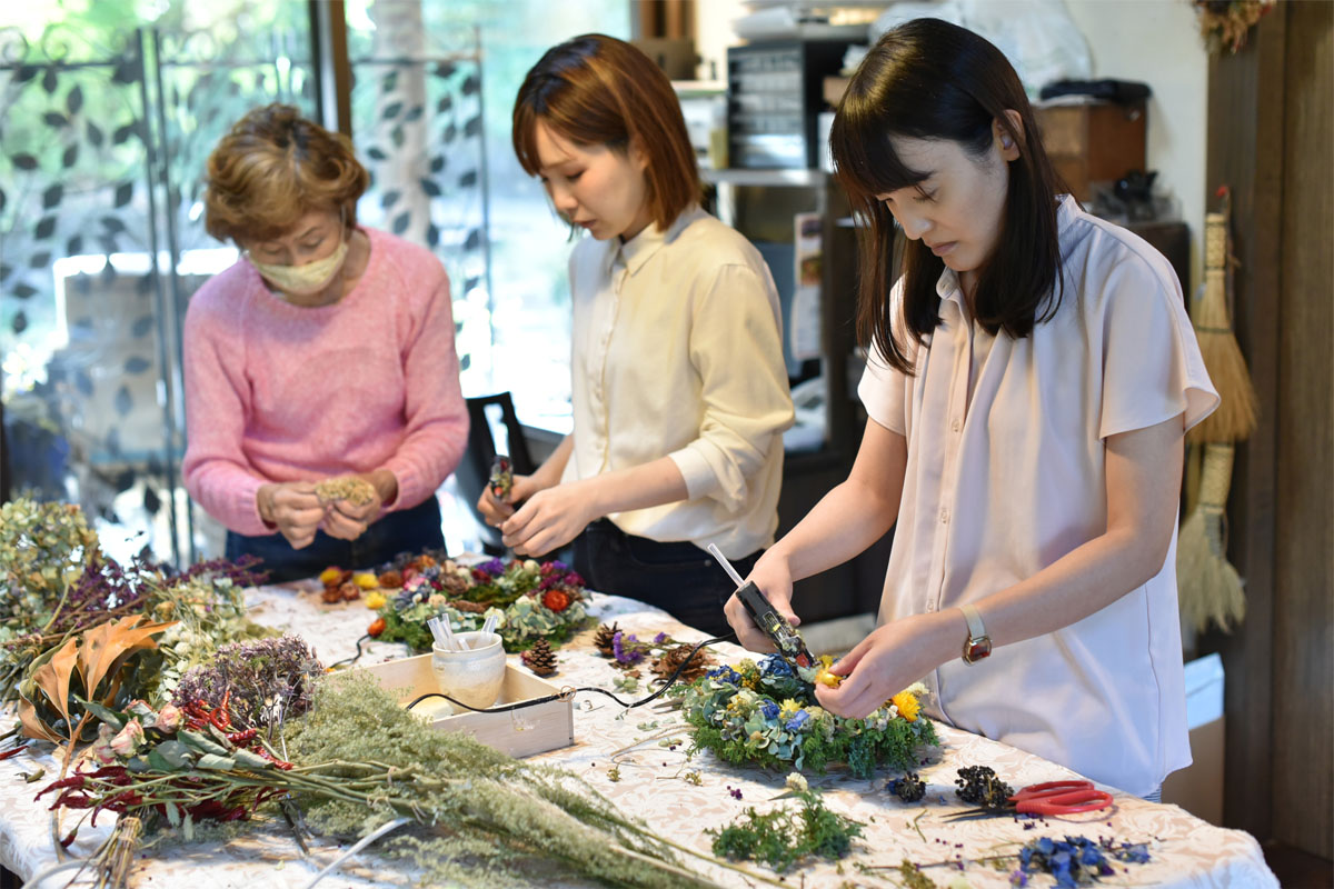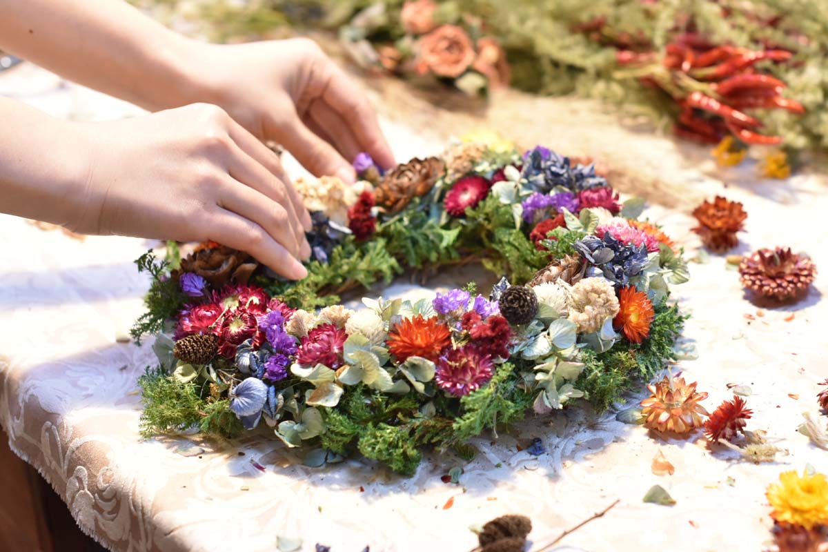 講師が種から育てたドライフラワーを素材に、オリジナルリースを作ります。直径25cmと飾りやすい大きさ。ドライフラワーで作るから、華やかで長持ちするのもうれしい! 初心者も作りやすい作り方のため小学生くらいから挑戦ができます。束ねるだけの「スワッグづくり」も好評です。