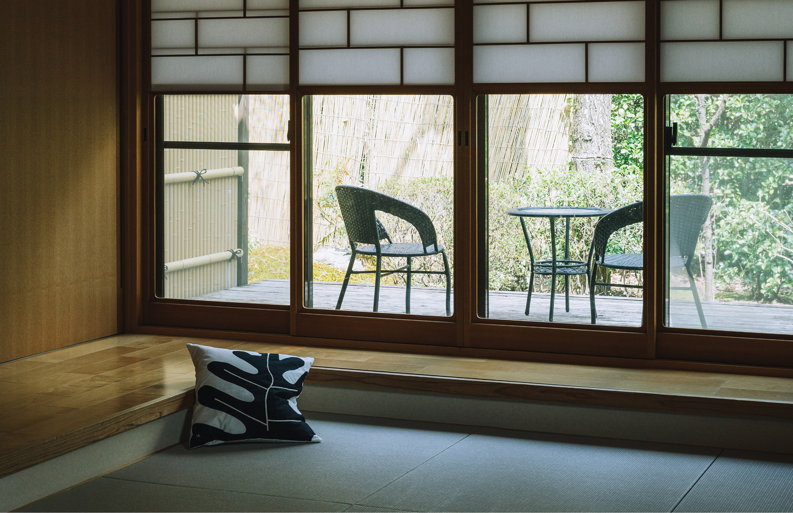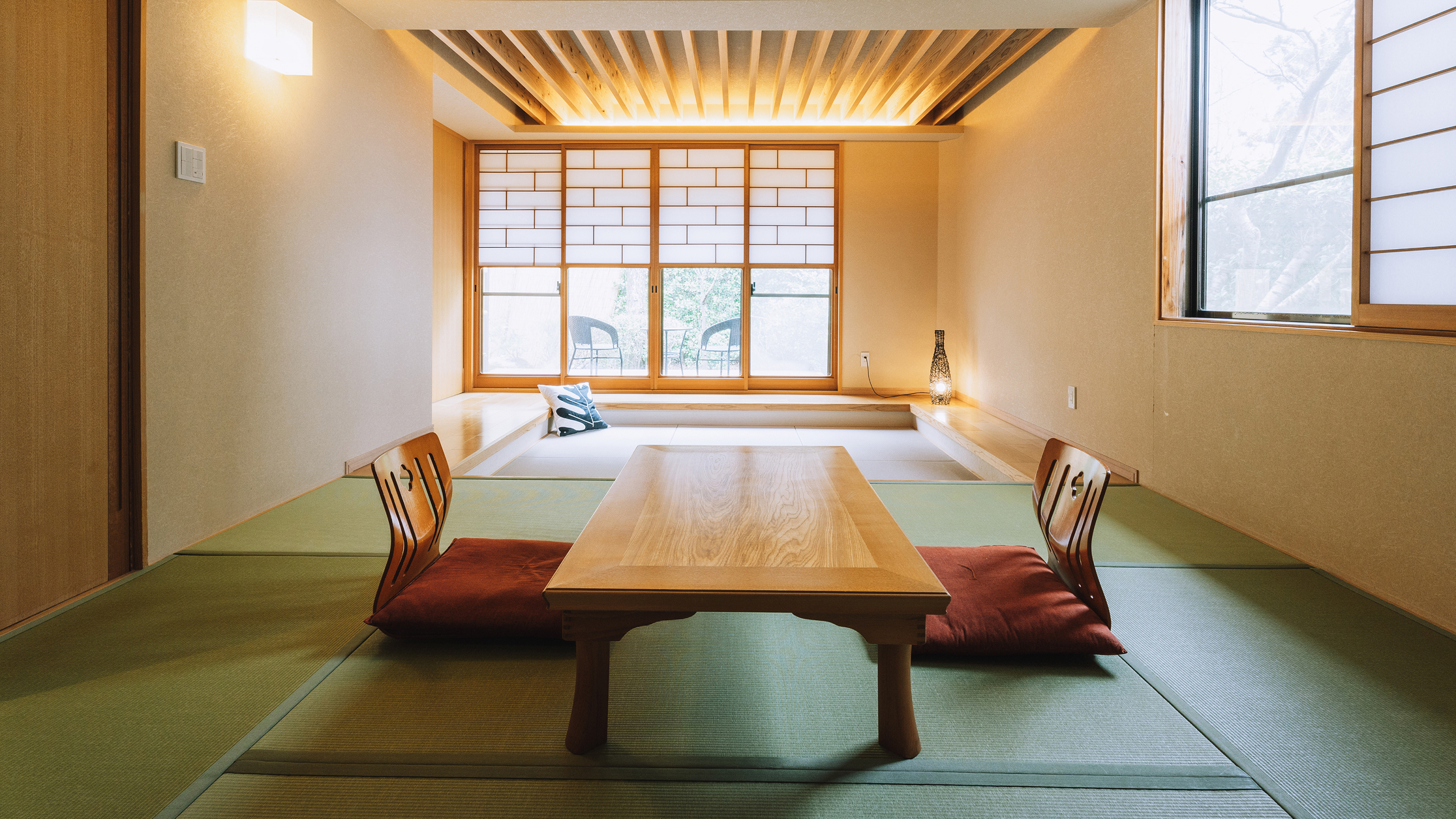 一段下がった堀座敷を備えた16畳の広々とした和室。思い思いにくつろぐことができる空間です。ゆったりと足を伸ばして、心をほどいてお過ごしください。