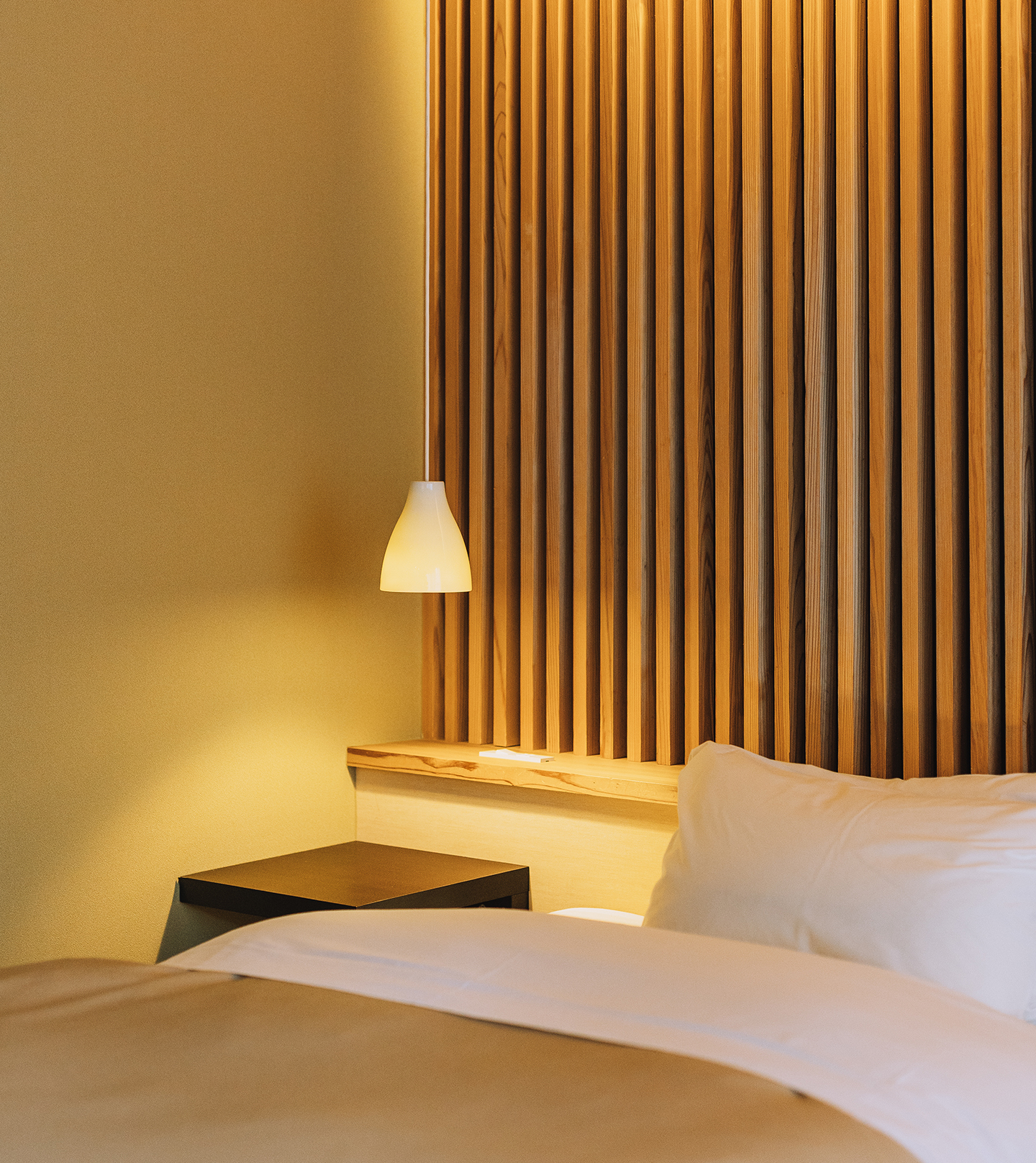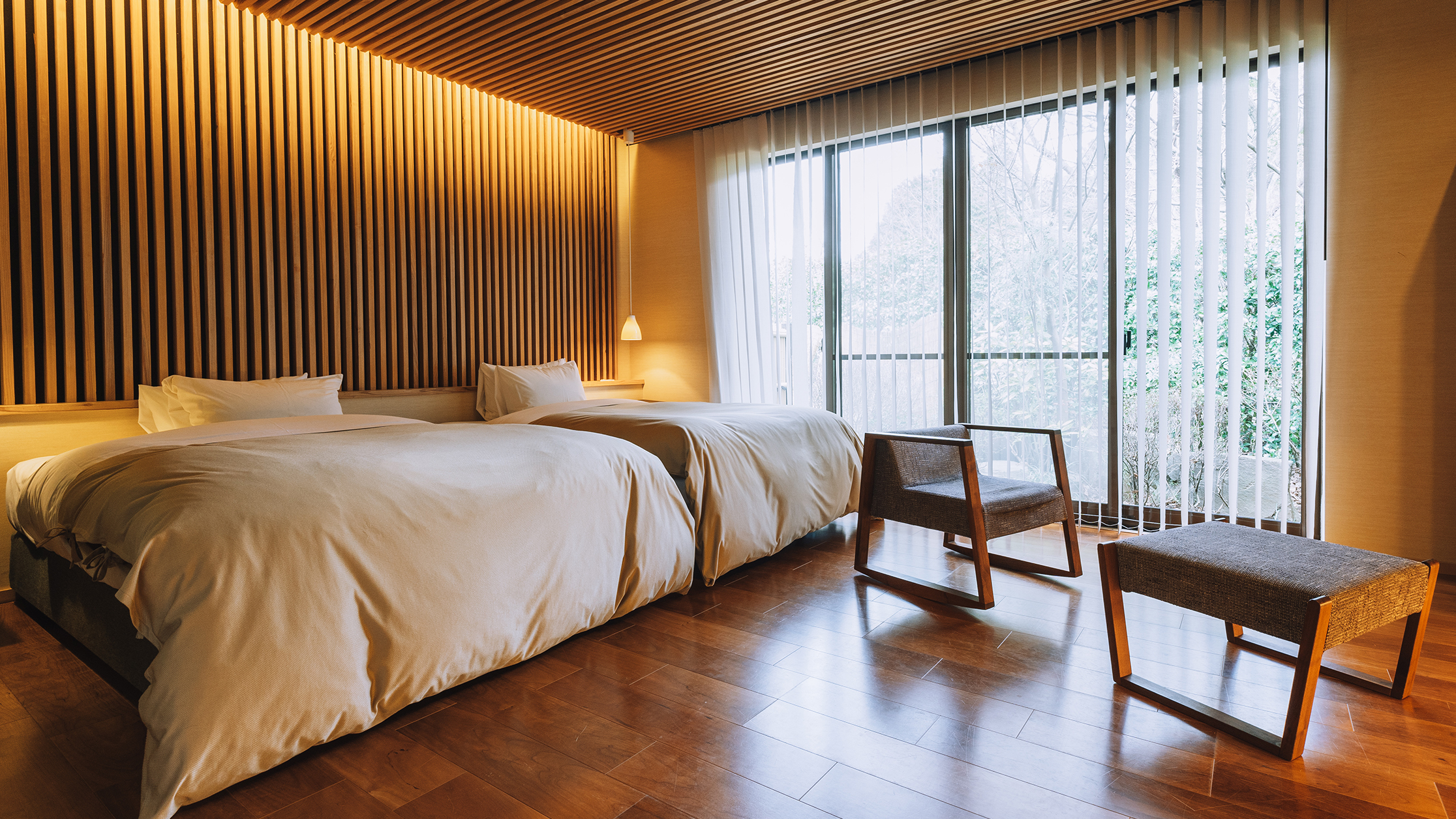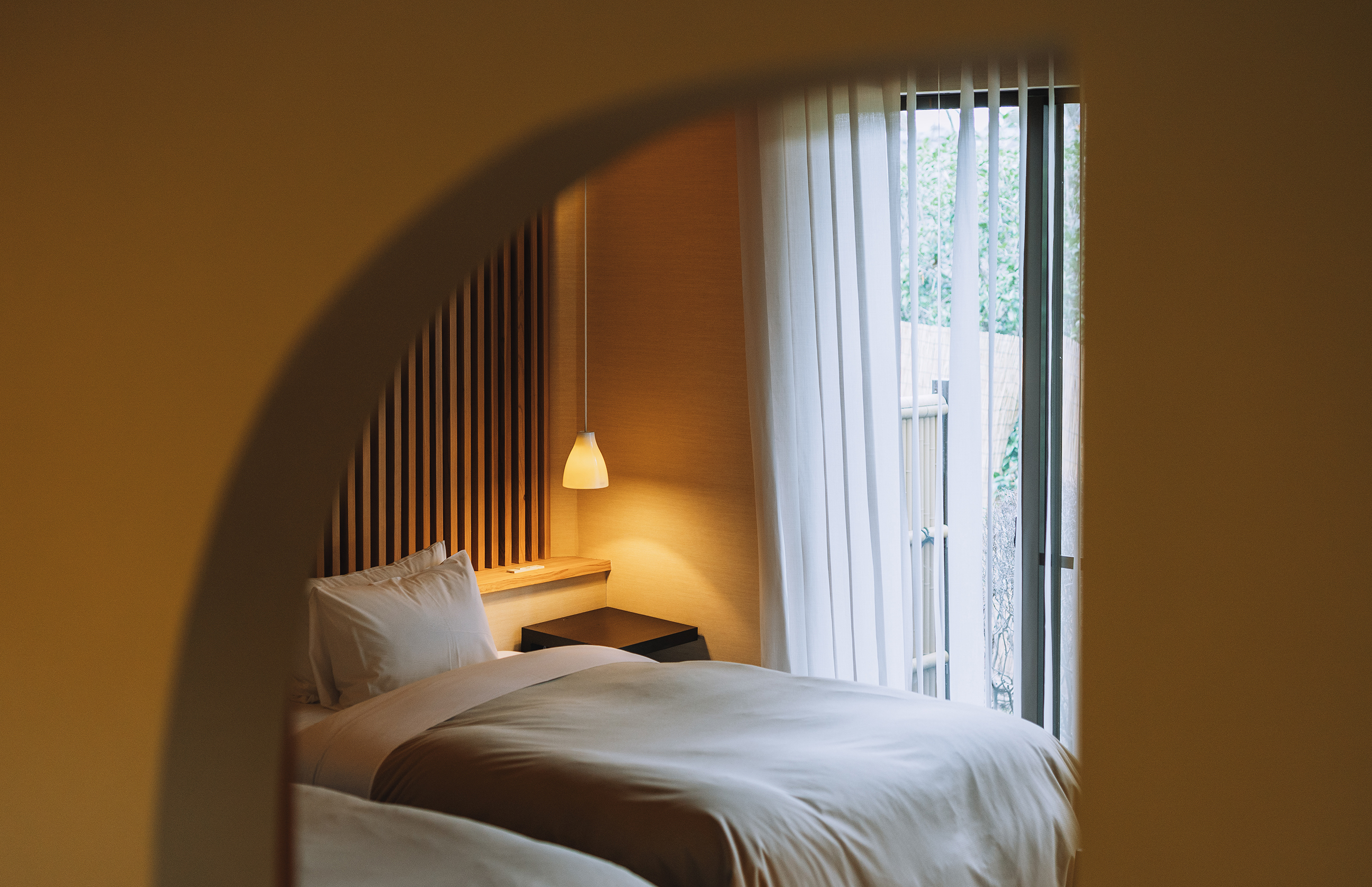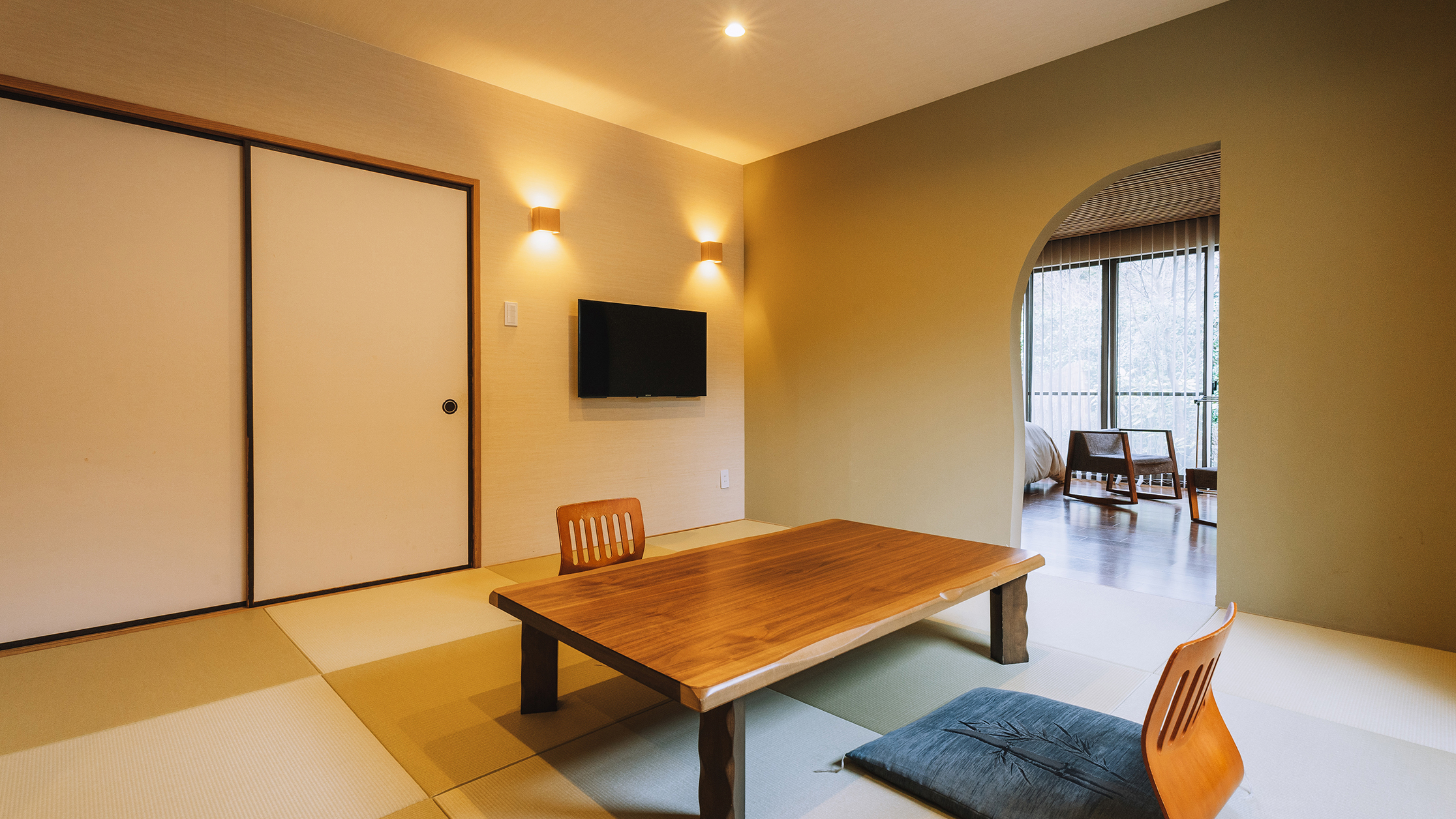 やわらかなデザインの仕切り、光の演出、そして和の趣向。静かに寛げる空間づくりにこだわった和洋室です。部屋に篭って、それぞれの時間をお愉しみいただけます。